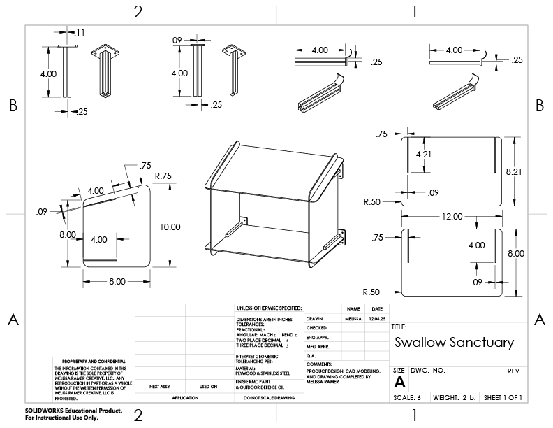 The Swallow Sanctuary is intentionally designed with few pieces that easily fit together without the need for tools. Each piece is designed to be removed easily if damaged, allowing for replacement of parts instead of purchasing of a whole new product. In this way, the Swallow Sanctuary can last as long as the barn swallows’ sturdy nests themselves.